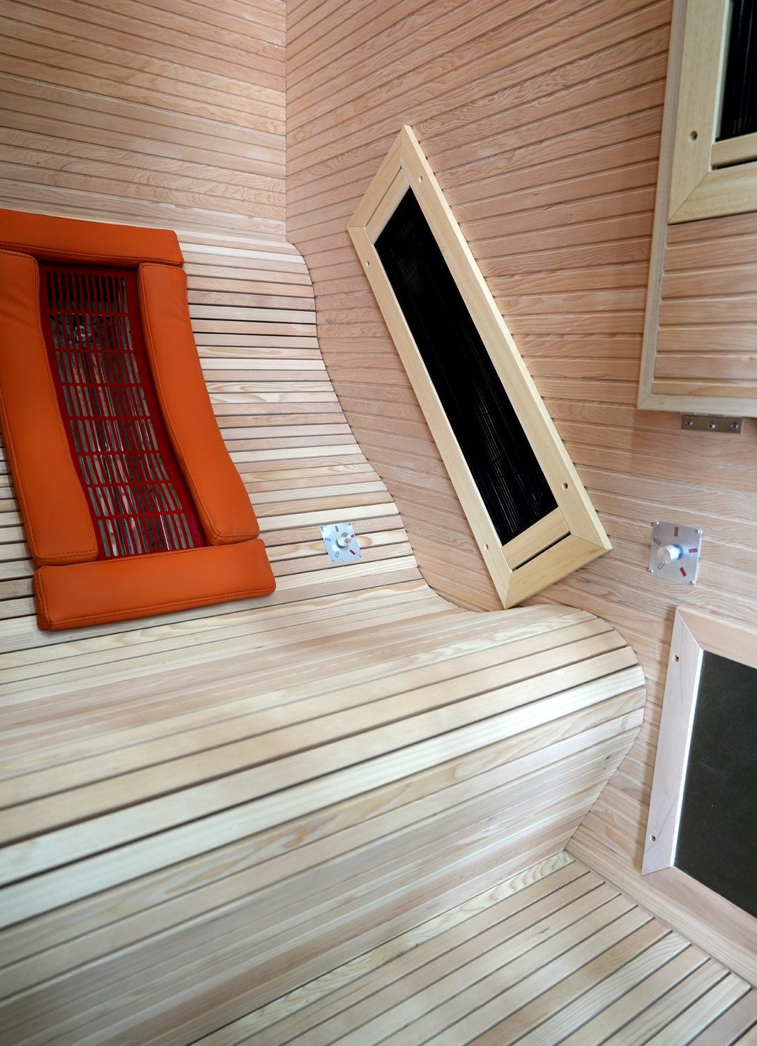 8mm厚铁杉木桑拿板,新款墙板(款式新颖,符合当下极简风格)、18mm厚实木凳板、柚木边框。德国EOS汗蒸控制器,日本进口碳纤维丝远红外加热板,欧洲进口理疗管。人体工程学全躺式座椅,专利设计多功能翻转小桌板,食品级耐高温硅胶软垫(可选黑、灰、橙颜色),耐高温防烫植绒护网,天地轴隐藏式五金合页(安全美观),4+4mm夹胶钢化玻璃,喜马拉雅盐晶灯(内置LED暖光灯带无频闪),蓝牙音乐播放器,高品质音响, 谷沃德门把手。