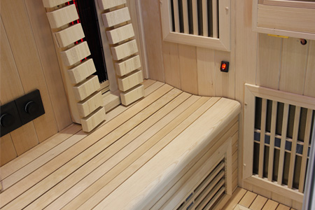 汗蒸踏板:采用与房体同样材质制作,表面镶嵌天然砭石,增强理疗效果,底部配有远红外云母碳晶加热板,不用担心冬天会踩在冰冷的石头上。 |
