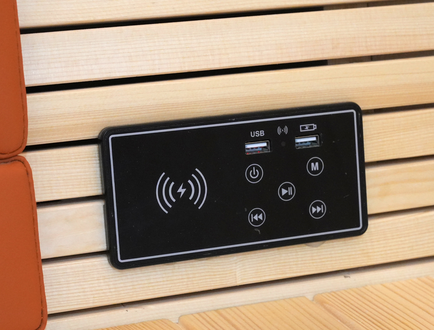 12mm厚德国云杉桑拿板(或10mm厚日本桧木桑拿板)、拼色房体及座椅、隐藏式远红外加热板、欧洲进口全光谱理疗管、德国EOS汗蒸控制器、半躺式人体工程学座椅、食品级耐高温硅胶软垫靠背、喜马拉雅盐晶灯、专利设计多功能翻转小桌板、耐高温防烫植绒护网、液压五金合页、4+4mm夹胶钢化玻璃、隐藏式暖光灯带、通风口、蓝牙音乐播放器、高品质音响、谷沃德柚木门把手、柚木门框