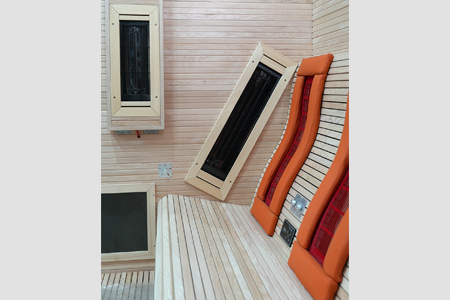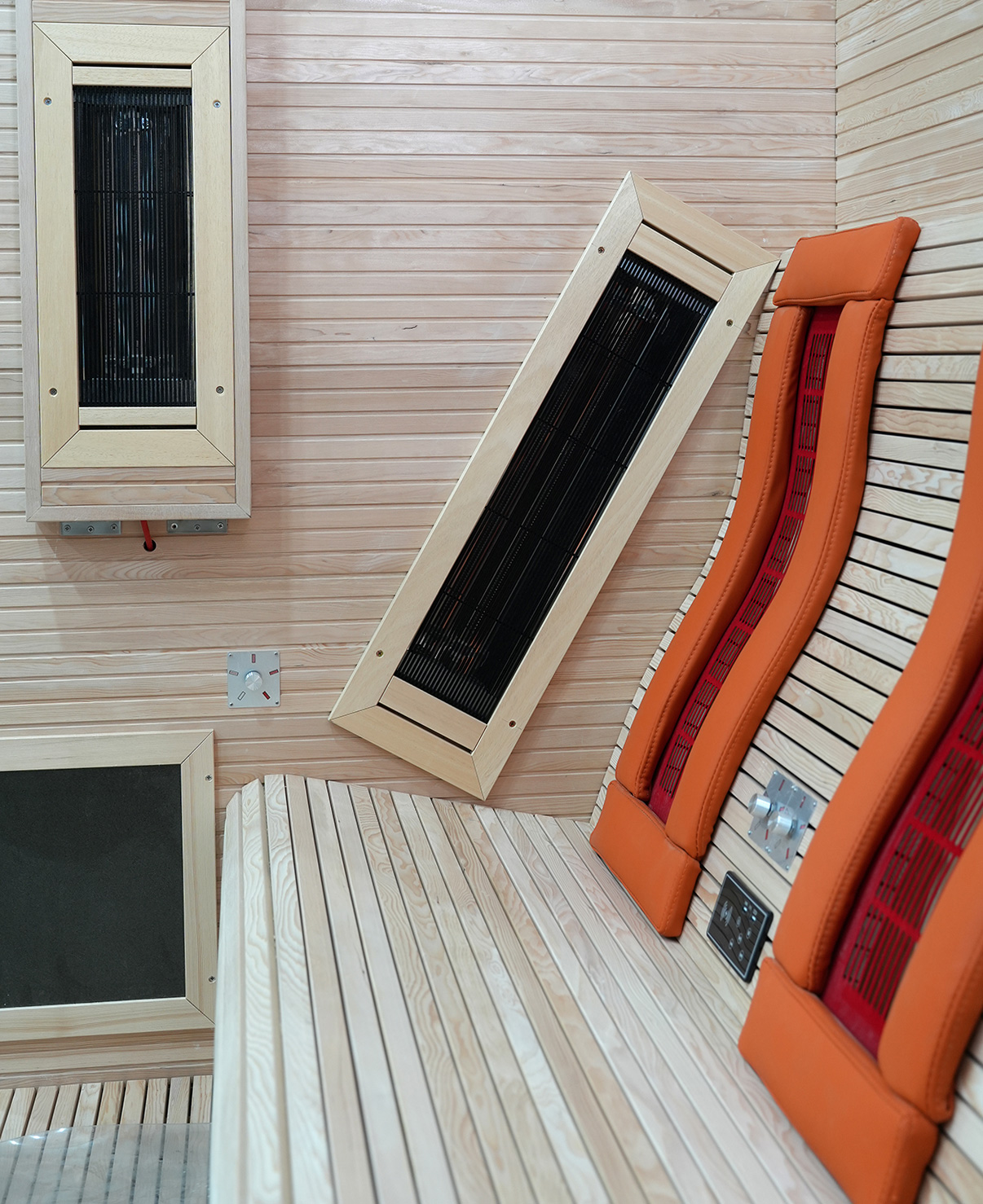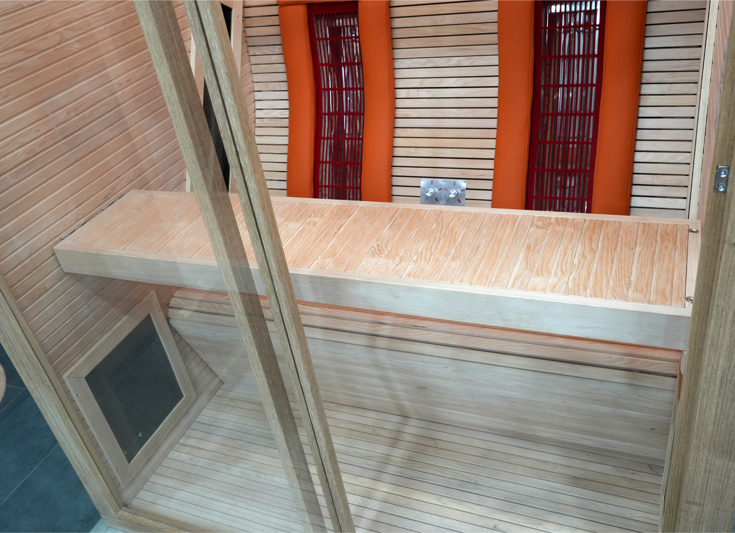 8mm厚铁杉木桑拿板,新款墙板(款式新颖,符合当下极简风格)、18mm厚实木凳板、柚木边框。德国EOS汗蒸控制器,日本进口碳纤维丝远红外加热板,欧洲进口理疗管。专利设计多功能翻转小桌板,食品级耐高温硅胶软垫(可选黑、灰、橙颜色),耐高温防烫植绒护网,人体工程学半躺式座椅,天地轴隐藏式五金合页(安全美观),4+4mm夹胶钢化玻璃,喜马拉雅盐晶灯(内置LED暖光灯带无频闪),蓝牙音乐播放器,高品质音响, 谷沃德门把手。