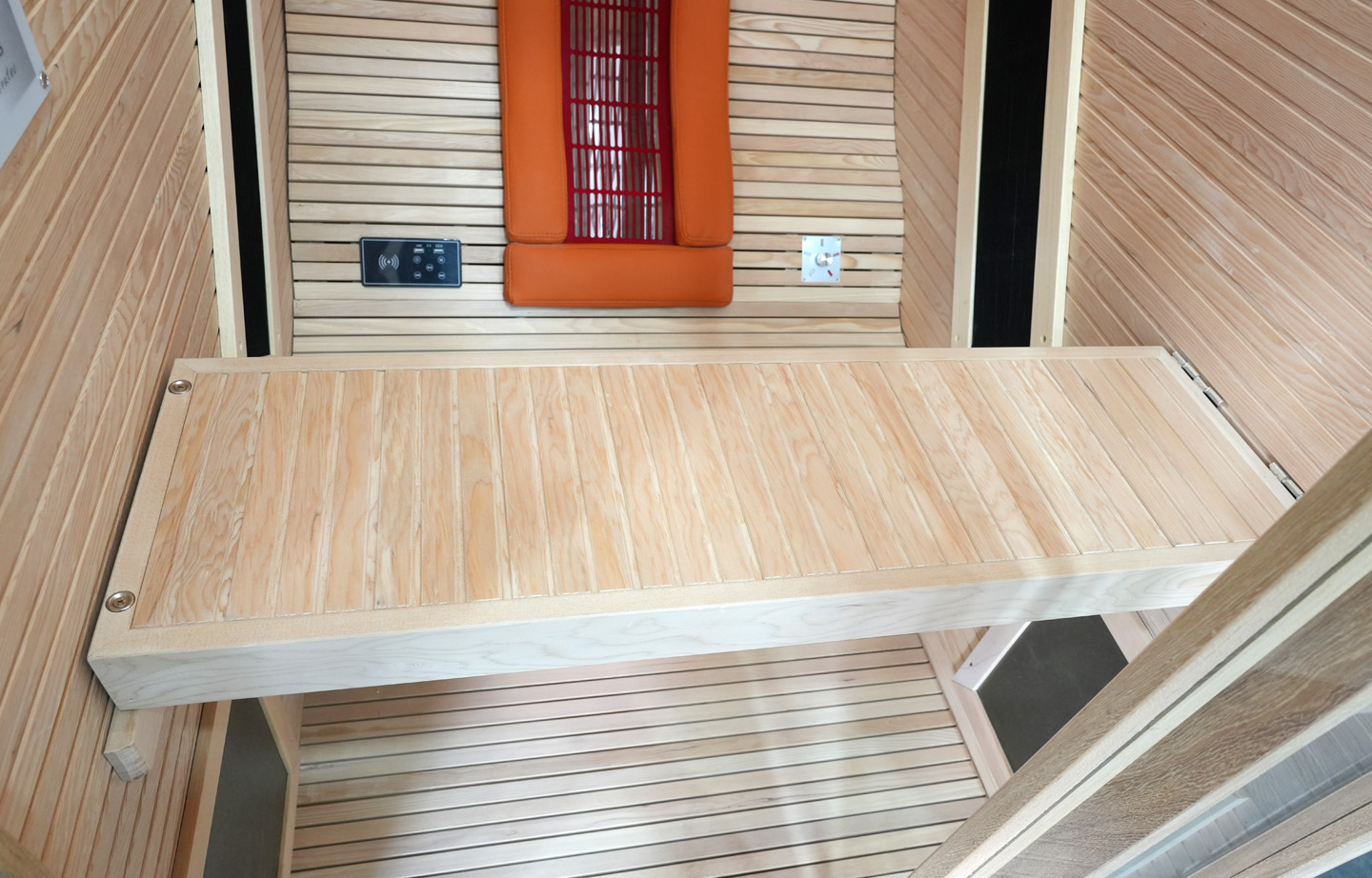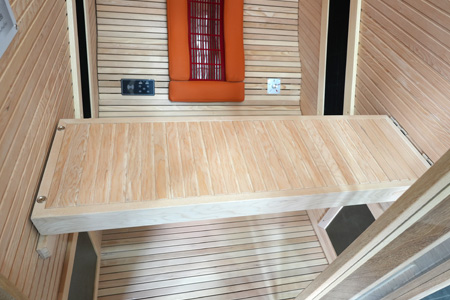 8mm厚铁杉木桑拿板,新款墙板(款式新颖,符合当下极简风格)、18mm厚实木凳板、柚木边框。德国EOS汗蒸控制器,日本进口碳纤维丝远红外加热板,欧洲进口理疗管。人体工程学全躺式座椅,专利设计多功能翻转小桌板,食品级耐高温硅胶软垫(可选黑、灰、橙颜色),耐高温防烫植绒护网,天地轴隐藏式五金合页(安全美观),4+4mm夹胶钢化玻璃,喜马拉雅盐晶灯(内置LED暖光灯带无频闪),蓝牙音乐播放器,高品质音响, 谷沃德门把手。