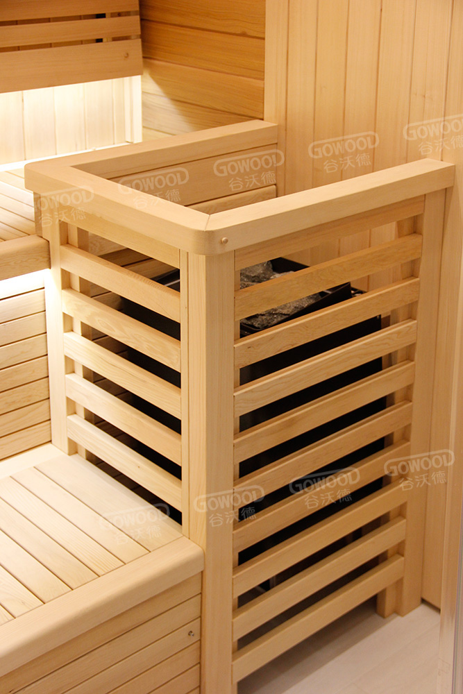 12mm厚铁杉木桑拿板、18mm厚铁杉凳板座椅、德国EOS桑拿炉、德国EOS按键数显控制器,黄玉石背景灯、弹簧靠背(专利设计)、德国EOS桑拿石、隐藏式可推拉收纳箱、座椅暖光灯带、意大利喀斯玛五金合页、芬兰哈维亚沙漏、哈维亚温湿度计、哈维亚木桶木勺、LED长条灯及玻璃灯罩、谷沃德门把手、落地实木炉罩、桑拿踏板、8mm钢化玻璃门(可选配4+4mm夹胶超白钢化玻璃)。